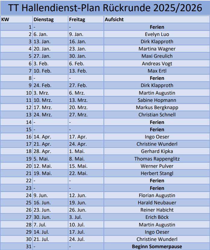 Bitte nehmt auch weiterhin die Aufgaben des Hallendienstes ernst. Um kurz ein paar Wichtige zu nennen: